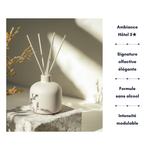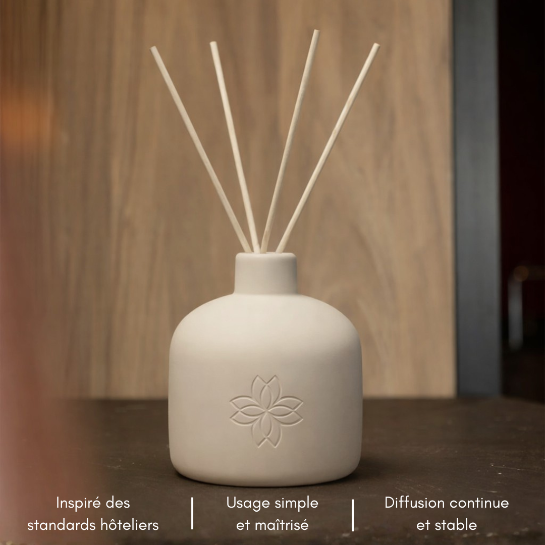 Le coffret contient notre jarre en céramique blanche d'une capacité de 220ml, une recharge de parfum (220ml ou 500ml au choix) et 10 bâtonnets en rotin