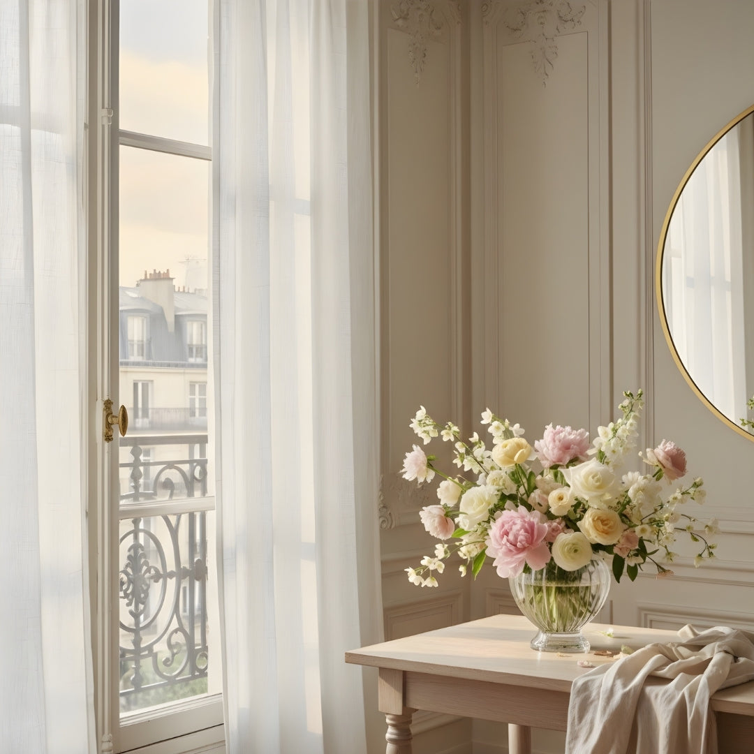 L’éclat d’un matin parisien. Rideaux tirés, lumière claire, fraîcheur délicate.